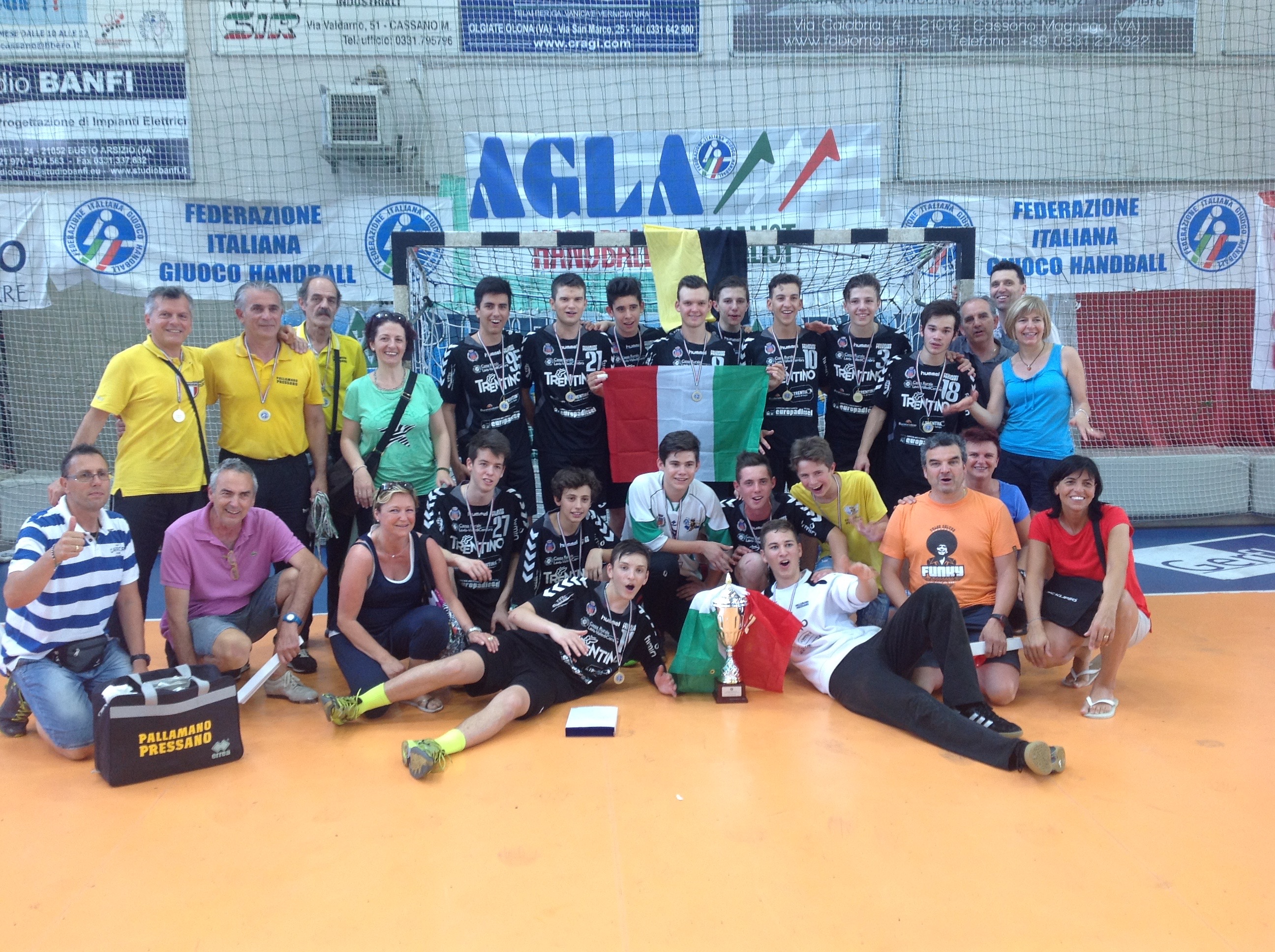 Il sogno è realtà. La Pallamano Pressano CR Lavis completa la favola giovanile e trionfa a Cassano Magnago nelle finali nazionali Under 18. Una cavalcata trionfale quella dei gialloneri che hanno conquistato il tricolore di categoria ad una sola settimana dalla conquista dello scudetto Under 16. Una doppietta storica, pietra miliare della pallamano giovanile italiana: all’inizio del cammino nessuno dei due titoli era pronosticabile, ed invece il cuore giallonero, l’impegno e la qualità hanno prevalso su tutto e su tutti. È dunque anche scudetto Under 18: un tricolore che arriva al termine di una finale dominata contro un Merano che aveva sempre battuto i gialloneri; proprio nel momento chiave però Pressano ha tirato fuori gli artigli, ha messo in scena una partita da antologia ed ha trionfato alzando il tricolore al cielo. È questa la grandezza del popolo e dei ragazzi gialloneri: nel momento del bisogno arriva la partita perfetta; e dire che il pronostico, così come in semifinale, era tutto per gli avversari. Pronti, via ed un Merano tonico si gioca subito tutte le carte in velocità e conduce per i primi 10′ ma mai con più di 1 rete di scarto. I gialloneri sono bravi a restare in partita grazie alla coppia Matteo e Nicola Moser che bucano la rete ospite; sono poi i rigori di D’Antino a portare Pressano verso un vantaggio sempre più largo. Al 20′ è 11-7 e la difesa giallonera chiude in maniera spettacolare: con una prestazione difensiva da incorniciare, condotta dai giovani gemelli Mengon e da un Facchinelli impeccabile fra i pali (2 rigori parati nel primo tempo) Pressano può dare ossigeno all’attacco ed il divario va così meritatamente aumentando, fino al 15-8 dell’ultimo minuto, perfezionato in 15-9 dal bomber meranese Stricker.