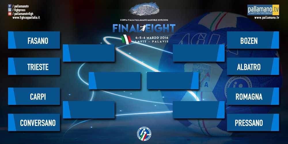 Sarà un avvio coi fuochi d’artificio quello in programma alla Final Eight di Coppa Italia che giunge alla sua 31^ edizione ed andrà in scena questo weekend al Palavis di Lavis. L’urna di Roma ha formato gli accoppiamenti per i Quarti di Finale del venerdì ed in campo ci sono già alcuni veri e propri big match. Sorteggio non felicissimo per la Pallamano Pressano CR Lavis che ha pescato il Romagna Handball, squadra di Imola con una grande storia alle spalle ed un percorso di crescita che l’ha portata a dominare il Girone B negli ultimi due anni, addirittura quest’anno senza perdere un solo punto per strada. Sarà anche il rematch della semifinale di Coppa Italia dello scorso anno, dove a Siracusa Pressano e Romagna si affrontarono con la vittoria finale dei gialloneri per 28-27. Tanti gli ingredienti per far partire al meglio la manifestazione: venerdì si inizierà alle 14.00 con il primo quarto di finale, Fasano-Trieste. Si procederà poi con il secondo match, Carpi-Conversano alle 16.00; alle ore 18.00 sul parquet del Palavis si sfideranno Bolzano e Siracusa per poi concludere la giornata alle 20.00 con il big match dei padroni di casa gialloneri, Pressano-Romagna. Tutto pronto quindi al Palavis, la cui preparazione è giunta ai dettagli: saranno tre giorni entusiasmanti, ricchi di incontri equilibrati e combattuti alla volta della coccarda tricolore. Tutti gli appassionati sono invitati a seguire le gare che saranno aperte al pubblico con ingresso gratuito per tutti.