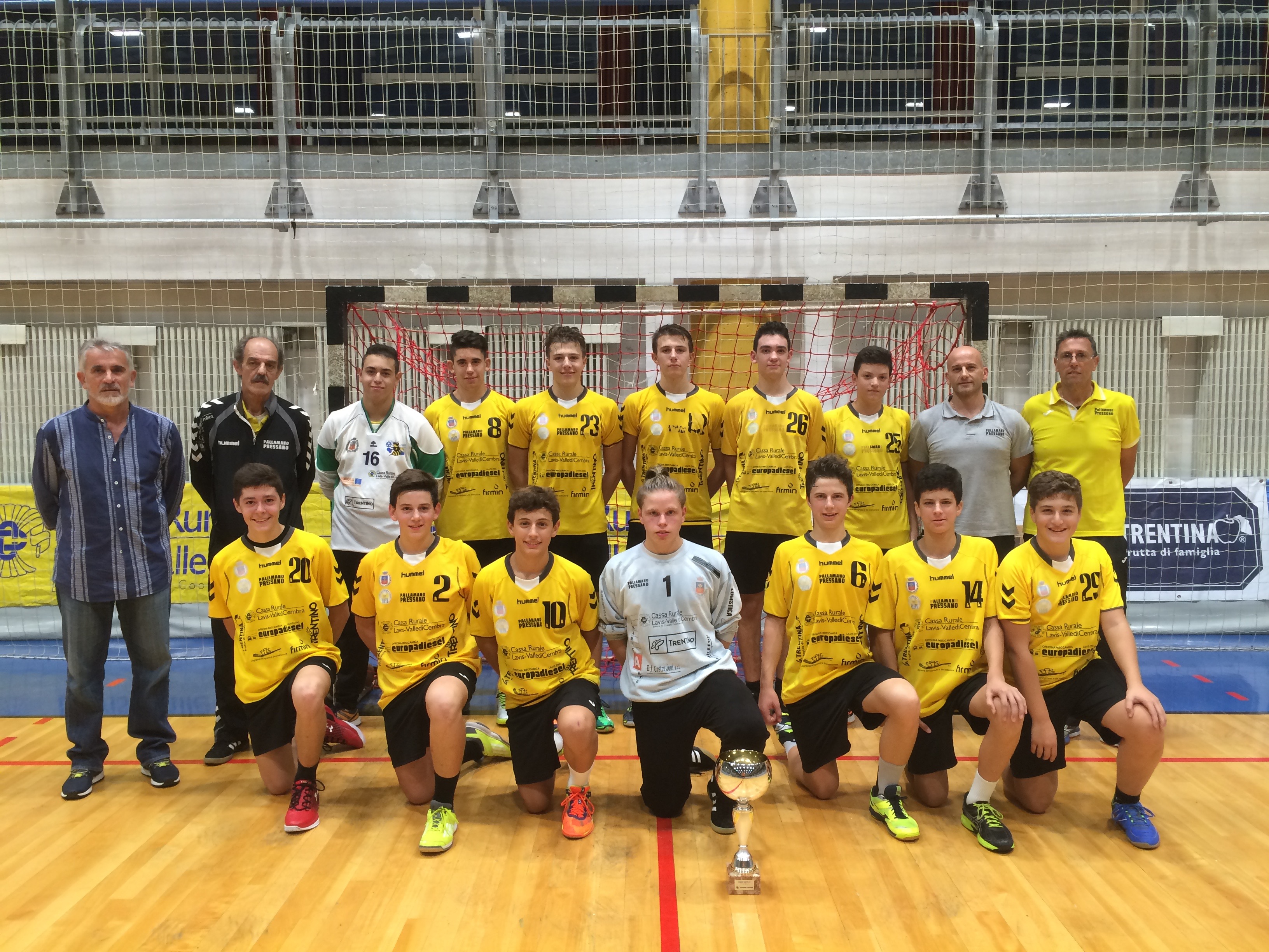 Un trionfo dunque che ha fatto da apertura verso il torneo Under 16, in scena questa domenica: presenti da tutte le regioni del NordItalia Pressano, Mezzocorona, Bressanone, Cologne (BS), Vicenza e Modena. Equilibratissimo il torneo con Mezzocorona e Bressanone che si sono imposte nei due gironi, conquistando la finalissima serale. Per Pressano una mattinata opaca, risollevata poi dalla vittoria contro Modena che è valsa la seconda piazza nel girone: nella finale 3º-4º posto contro Cologne tuttavia non c’è stata storia, con i lombardi che hanno vinto nettamente. Per quanto riguarda la finale, Mezzocorona e Bressanone hanno lottato per 40’: dal 20-20 tuttavia i rotaliani di mister Kovacic hanno ingranato la marcia giusta e si sono imposti 27-23, conquistando meritatamente il trofeo. Due domeniche brillanti, allestite alla perfezione dalla società del Presidente Giongo. Un ringraziamento va alle squadre che hanno partecipato ma anche anche a tutti i genitori e tifosi gialloneri, presenti e disponibili per l’organizzazione degli eventi e dei pranzi per le squadre. La Pallamano Pressano si appresta dunque ad iniziare i campionati giovanili con buone sensazioni: sabato 22 ottobre primo incontro ufficiale della stagione.