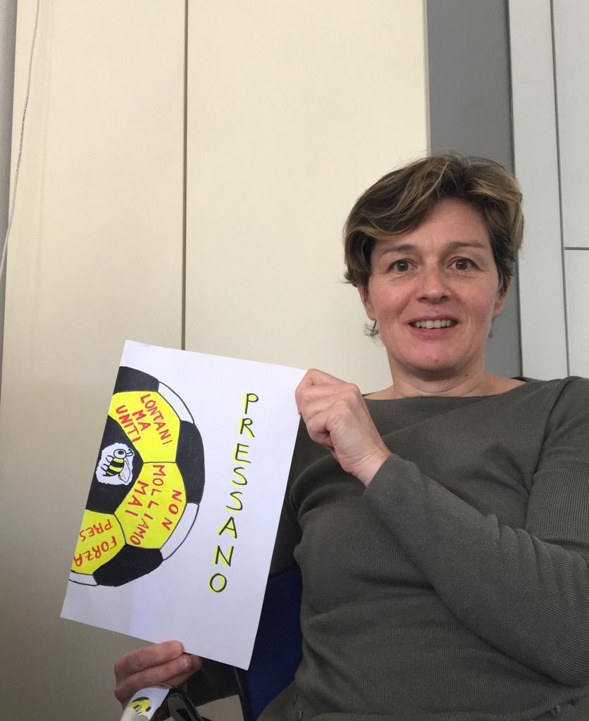 3. Scatta una foto in tema giallonero (magari con la tuta della società) dove tieni in mano il disegno in primo piano. Fai in modo che il bordo del disegno sul lato incompleto sia fuori dal tuo corpo (come Flavia nella foto qui sotto!).