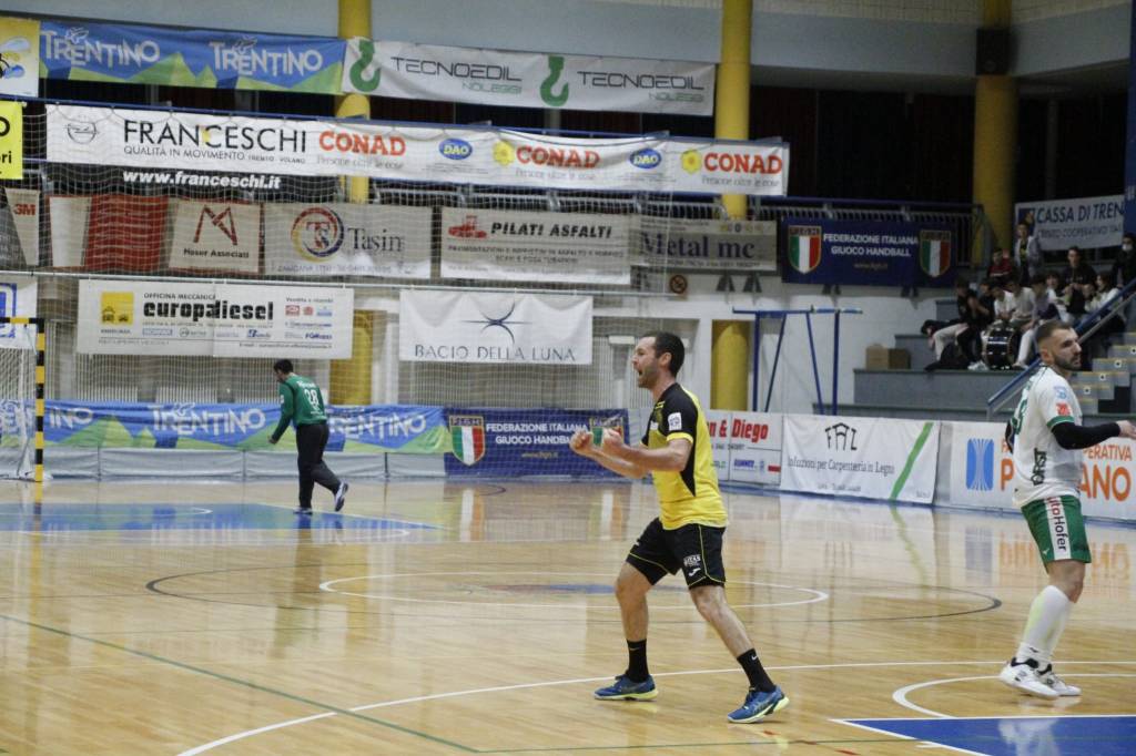 L’atmosfera è quella della partita di cartello ed il match non delude: livello altissimo già dalle prime battute, con le due squadre che si fronteggiano a viso aperto. Ottime difese in avvio, con Pressano meno unito degli avversari ma sorretto da Loizos ed i gialloneri, dopo minuti di stallo, conducono: prima Jansson, poi Alberino in serie trascinano la squadra di casa sul 6-4, poi massimo vantaggio 10-7 e la gara si fa palpitante. Bressanone risponde con le soluzioni individuali del proprio collettivo ma è Pressano ad apparire più in partita; ancora ottima difesa e primo tempo che si chiude sul 14-12 resistendo a ben 3 inferiorità numeriche. Avvio di ripresa più favorevole agli ospiti: la classe di Cutura e l’impostazione di gioco fruttano. Pivot e ali, Brixen c’è eccome: balzo improvviso sul 17-18, primo ed unico vantaggio della partita. Pressano è impietrito ed anche un’ottima prestazione come quella messa in campo sembra non bastare: ma i gialloneri hanno il cuore il più, ed ecco che nel momento del brivido arrivano tre palloni recuperati e due contropiede di Iachemet fanno break di 3-0, 20-18 e distanze ristabilite. Quando il gioco si fa duro, Pressano mostra i muscoli: è Dallago a suonare la carica. Il terzino giallonero orchestra a meraviglia assieme a Fadanelli ed è un tandem vincente. Proprio Dallago comincia a martellare la porta difesa dall’ex Sampaolo – premiato ad inizio gara con una targa di riconoscimento per i 10 anni in giallonero – e tiene alto il vigore offensivo dei suoi.