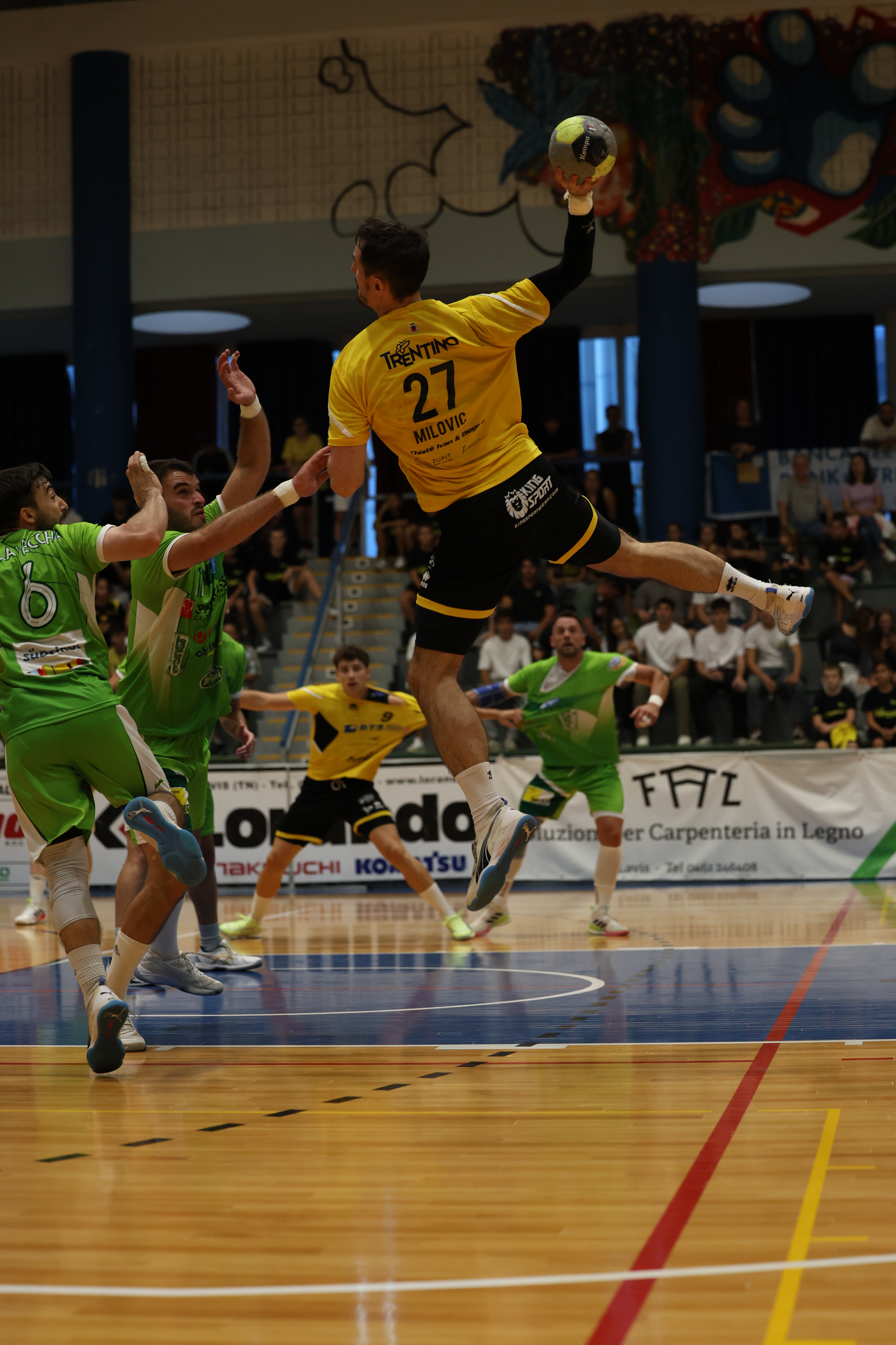 Il miglior Pressano della stagione si mette in mostra con autorità ed espugna il campo di Noci, casa dei campioni d’Italia del Conversano, col punteggio di 25-32 nella quarta giornata di Serie A Gold. Un capolavoro la partita messa in campo da mister Dumnic ed i suoi ragazzi, capaci esprimere una pallamano vincente in ogni settore ed ogni fondamentale: in vantaggio dal primo all’ultimo minuto, la squadra trentina non ha mai dato l’impressione di poter soccombere di fronte agli scudettati biancoverdi, conducendo il match sempre con margine, portandolo a compimento fino alle sette reti di divario della seconda sirena.