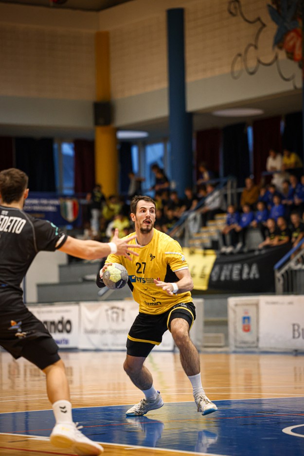 Pressano approcia bene e passa a condurre ma Merano risponde presente e firma per la prima volta il vantaggio sul 4-5 dopo 6’. Sono tante le reti grazie agli attacchi prolifici che prevalgono sulle difese: l’equilibrio regge fin sul 9-9 quando Pressano ingrana ed infila un bel break di 4-0 che spacca la partita per il 13-9. La risposta dei Black Devils è immediata e grazie ad un ottimo Conte (11 reti) Merano infila un contro parziale di 1-6 che porta a condurre gli ospiti. Il primo tempo lascia spazio però per un altro colpo di reni dei padroni di casa che chiudono in vantaggio i primi 30’, 17-15. La ripresa parte col piede giusto per la squadra locale: D’Antino e Fadanelli infilano la porta avversaria per il 20-16, poi uno scatenato Milovic (11 reti e top scorer della partita) e le parate del portiere di Pressano Loizos favoriscono il massimo vantaggio sul +5. È il divario che i gialloneri non lasceranno mai più, perché a metà ripresa è ancora Milovic due volte a porta vuota a fare +6, con Pressano che fallisce il possibile +7 e poi si lascia andare sugli allori, consentendo agli ospiti una timida rimonta nel finale che non va oltre il -3: senza patemi d’animo Pressano conduce il risultato in porto e vince la partita sul 33-30.