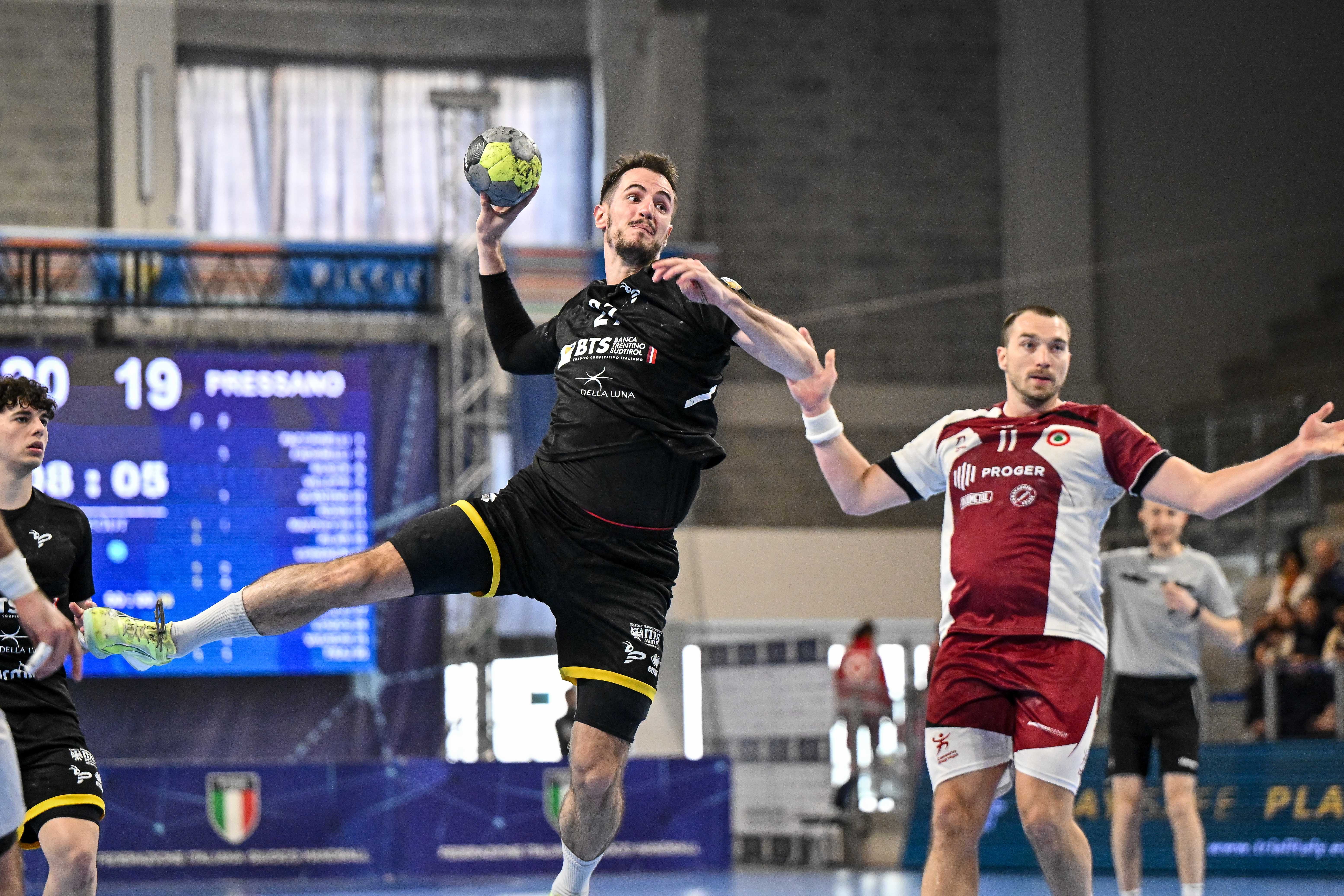 Nel match apre le marcature del match la Pallamano Pressano ma fin dai primi minuti si assiste ad un match veloce, dinamico e favorevole agli attacchi sulle difese. La sfida procede equilibrata, senza dare l’impressione di avere una strada già scritta: 3-4 Pressano dopo 6’, poi Brixen firma il primo parziale dell’incontro e mette la freccia, 6-4 con i gialloneri costretti ad inseguire. Da qui i padroni di casa mantengono il comando delle operazioni, mai sopra le due reti di vantaggio, e riescono a reggere alle iniziative giallonere mentre un Pressano a tratti stanco e poco preciso continua a rispondere colpo su colpo. Un continuo tira e molla conduce le due squadre lungo tutta la prima frazione: dal 10-10 al 20’ arriva il nuovo strappo dei padroni di casa, abili a sfruttare la poco precisa difesa della squadra di Dumnic per condurre nuovamente con due reti di vantaggio, perfezionate nel 14-13 di fine primo tempo. Scoppiettante anche la ripresa: senza timori, i due schieramenti premono sull’acceleratore e fioccano le reti. Permane l’equilibrio totale, con il punteggio sempre inchiodato attorno al pari; torna avanti Pressano al 14’ sul 23-24, ma nuovamente risponde Brixen ristabilendo la parità. Quando mancano 10’ alla fine della ripresa Pressano prova ad innestare la marcia: Martini e Wierer fanno 25-27, poi Fadanelli in inferiorità firma il +3. Ancora alta l’asticella in difesa per i gialloneri che recuperano un altro pallone ma falliscono il +4, Brixen accorcia e la partita resta apertissima. Altri 3 attacchi falliti consecutivamente valgono il pari per Bressanone, 28-28 a 3’ dalla fine.