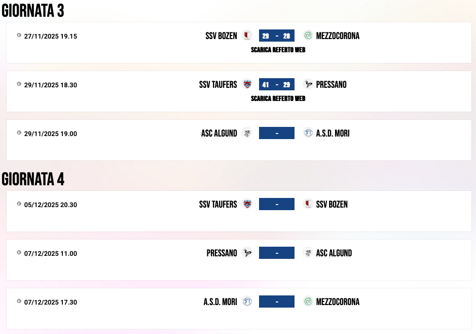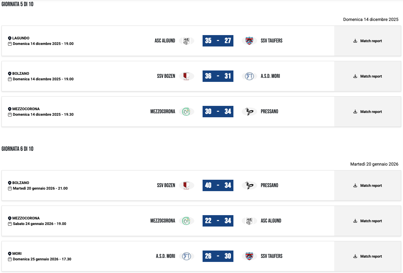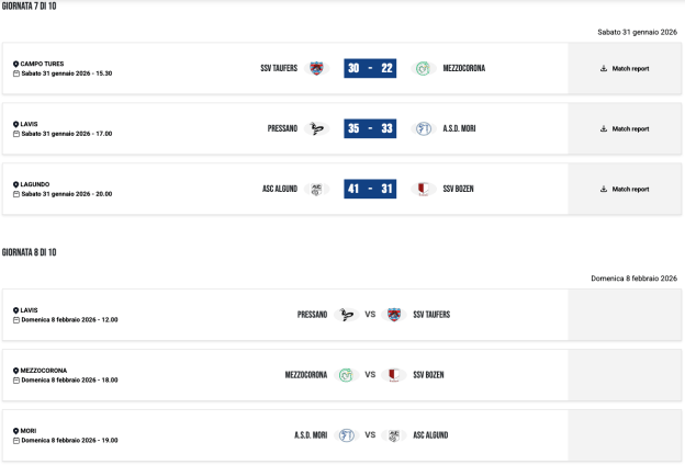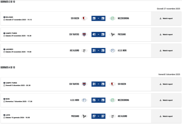 | 12/02/25 | 18:30 | MORI | 32 – 29 | SSV BOZEN | |