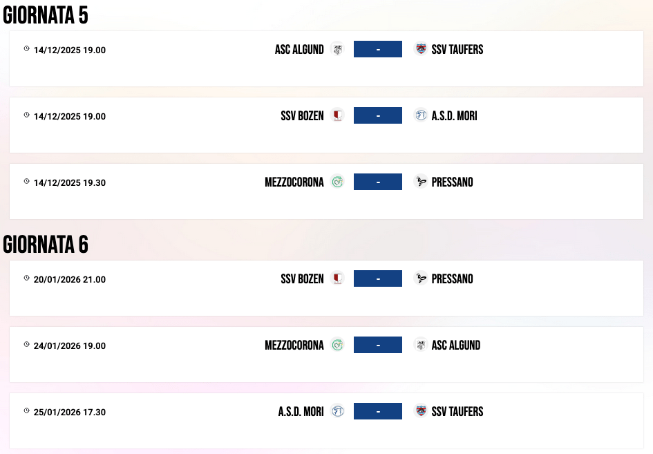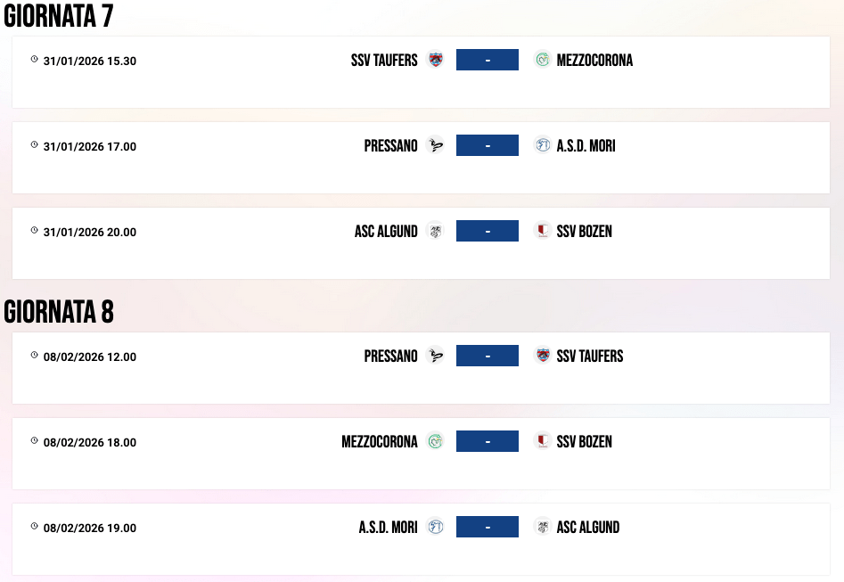 | 14/01/23 | 16:00 | MORI | 0 – 0 | SSV BRIXEN | |