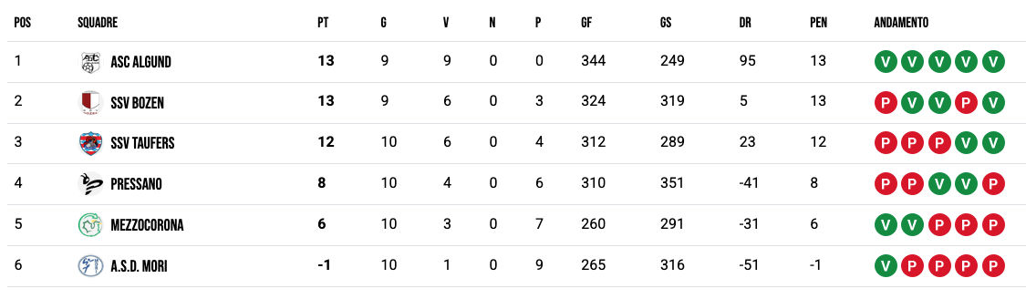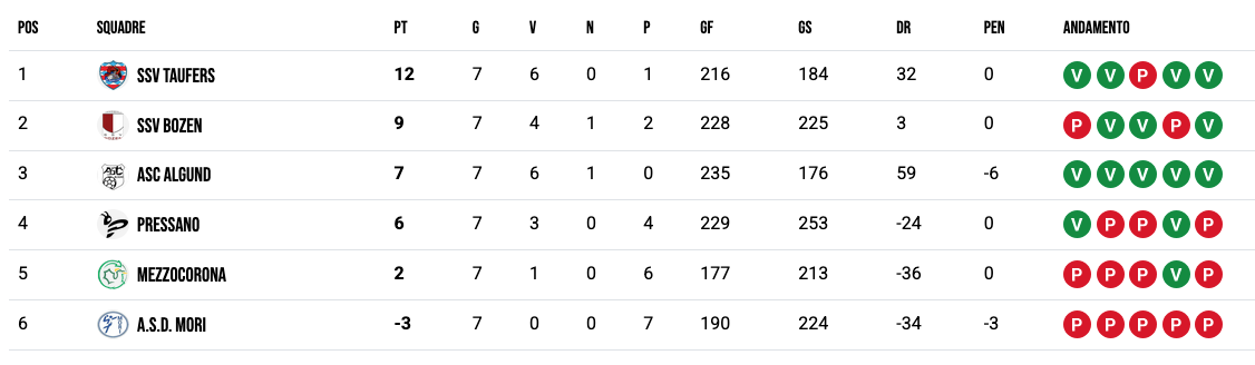 | SSV BOZEN | 10 | 12 | 5 | 0 | 7 | 340 | 343 |