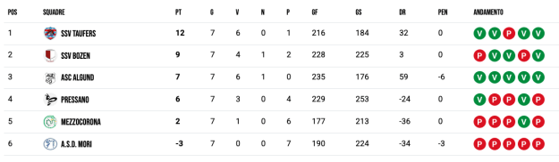 | SSV BOZEN | 6 | 3 | 3 | 0 | 0 | 124 | 69 |