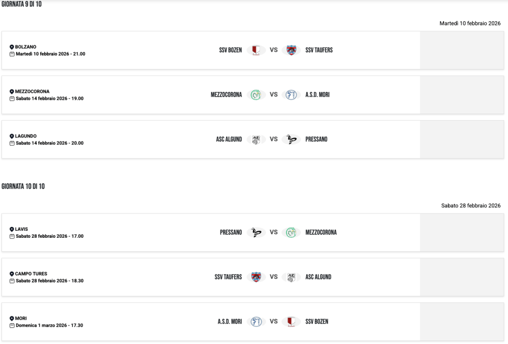 | 29/02/24 | 20:30 | SSV BOZEN | 0 – 0 | SSV BRIXEN | |
