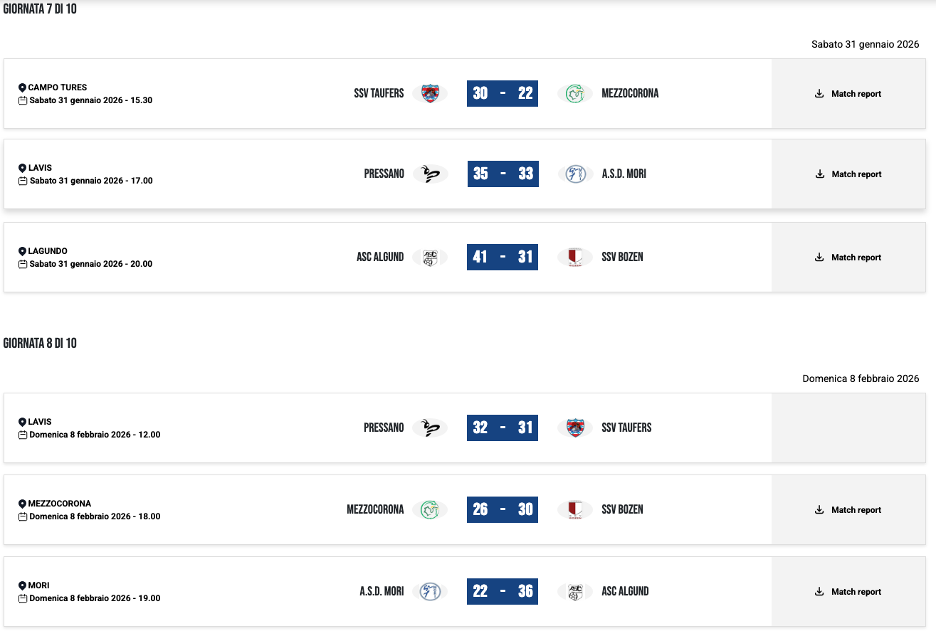 | 08/02/25 | 19:00 | MEZZOCORONA | 33 – 29 | SSV TAUFERS | |