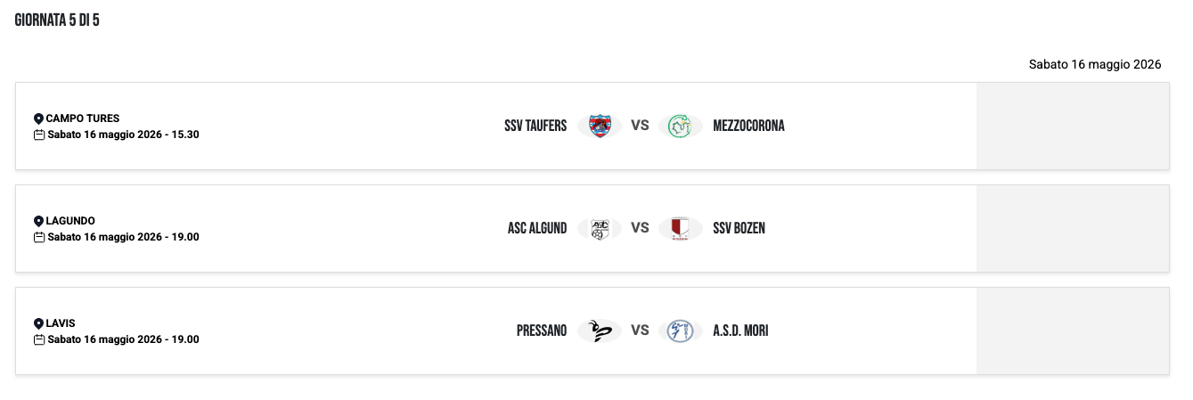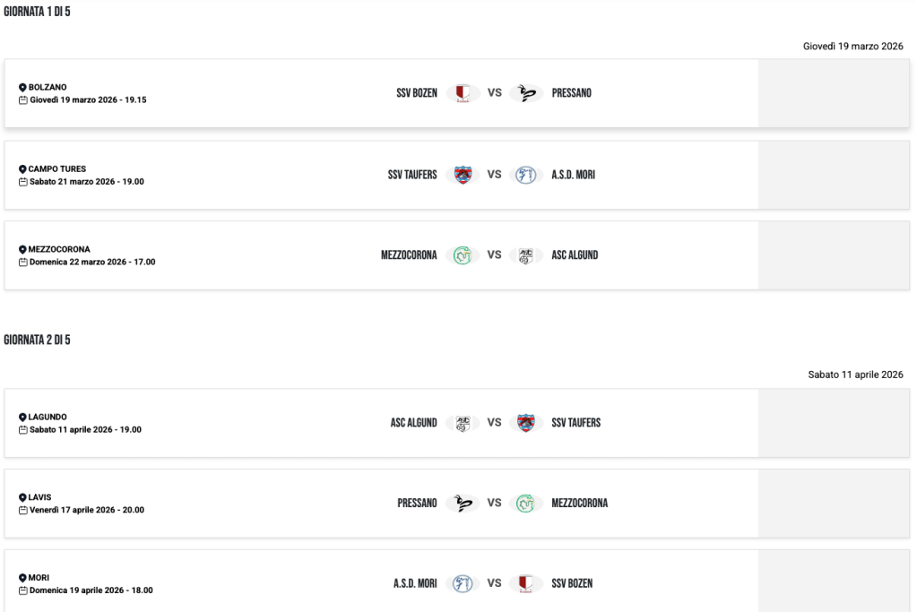 | 25/03/23 | 19:00 | SSV BRIXEN | 0 – 0 | MORI | |
