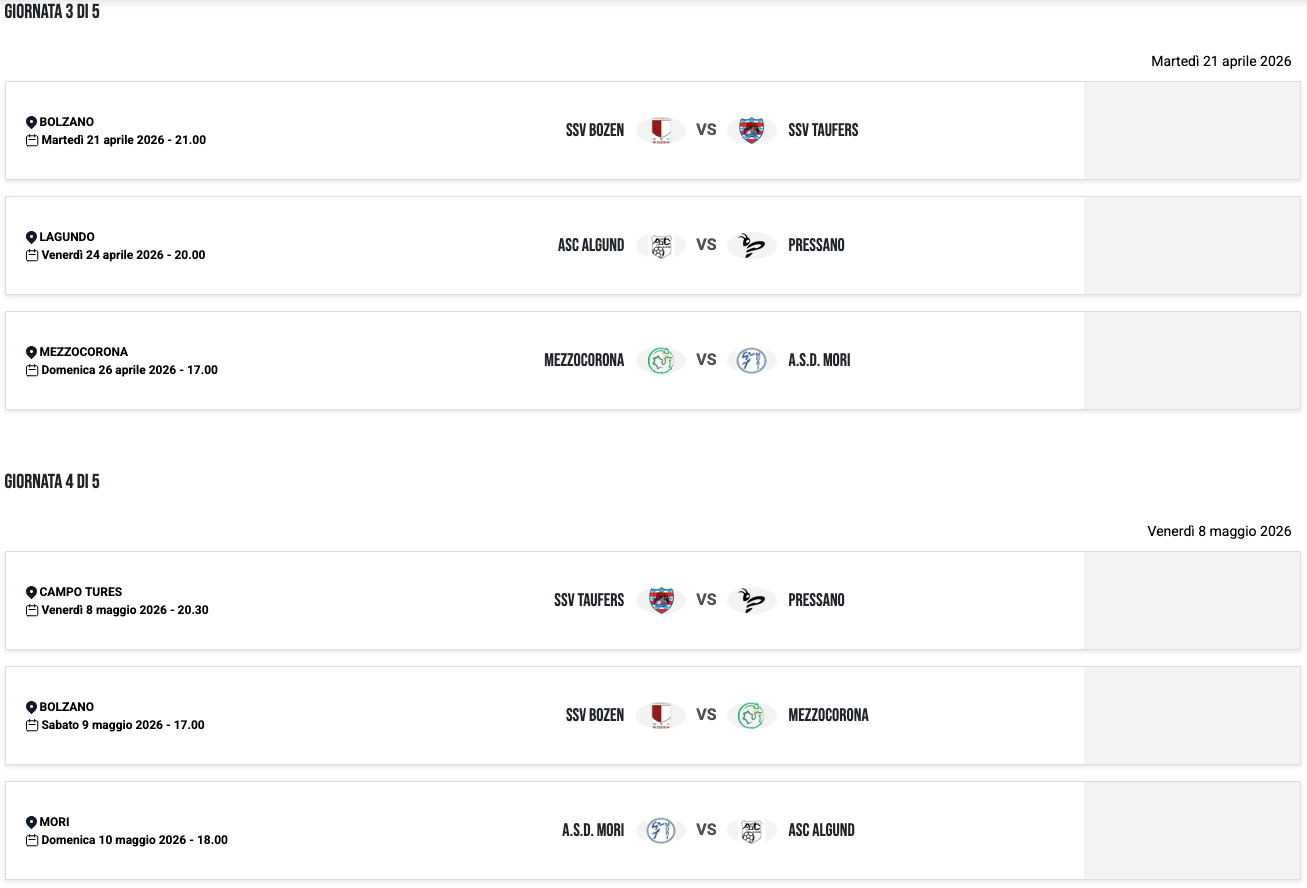 | 19/03/23 | 19:00 | SSV BOZEN | 0 – 0 | SSV BRIXEN | |