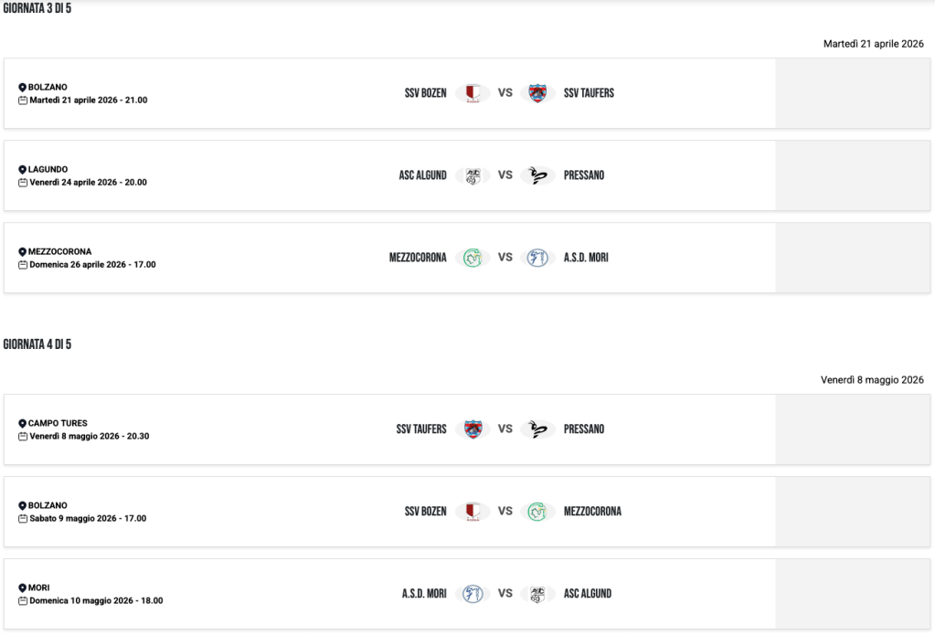 | 21/04/24 | 19:00 | PRESSANO | 0 – 0 | ASV EPPAN | |
